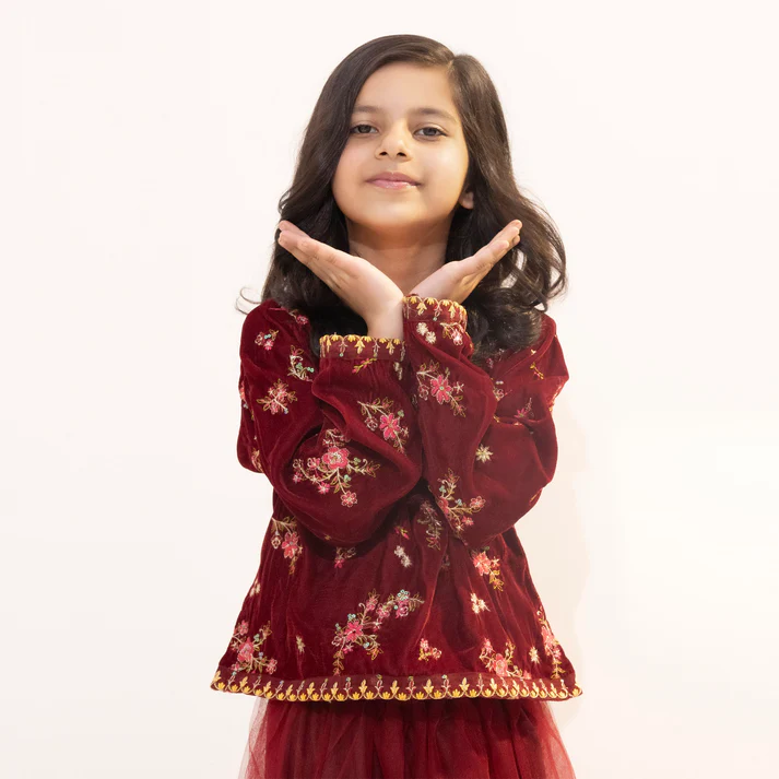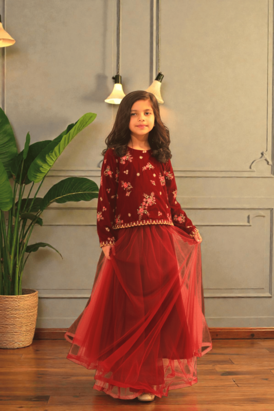 Girls Maroon Velvet Embroidered Top with Net Skirt Set