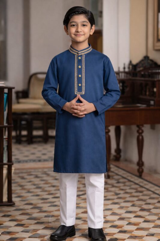 Boys Zinc Blue Khaddar Kurta with White Trouser