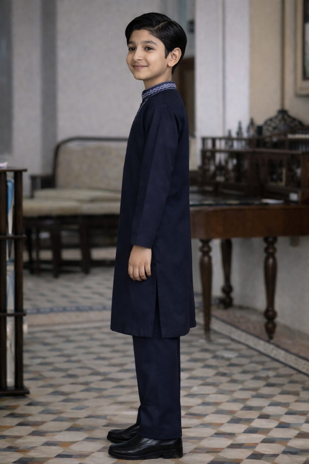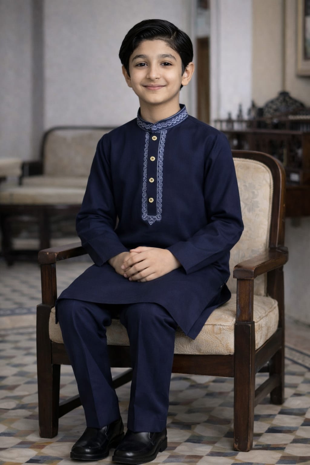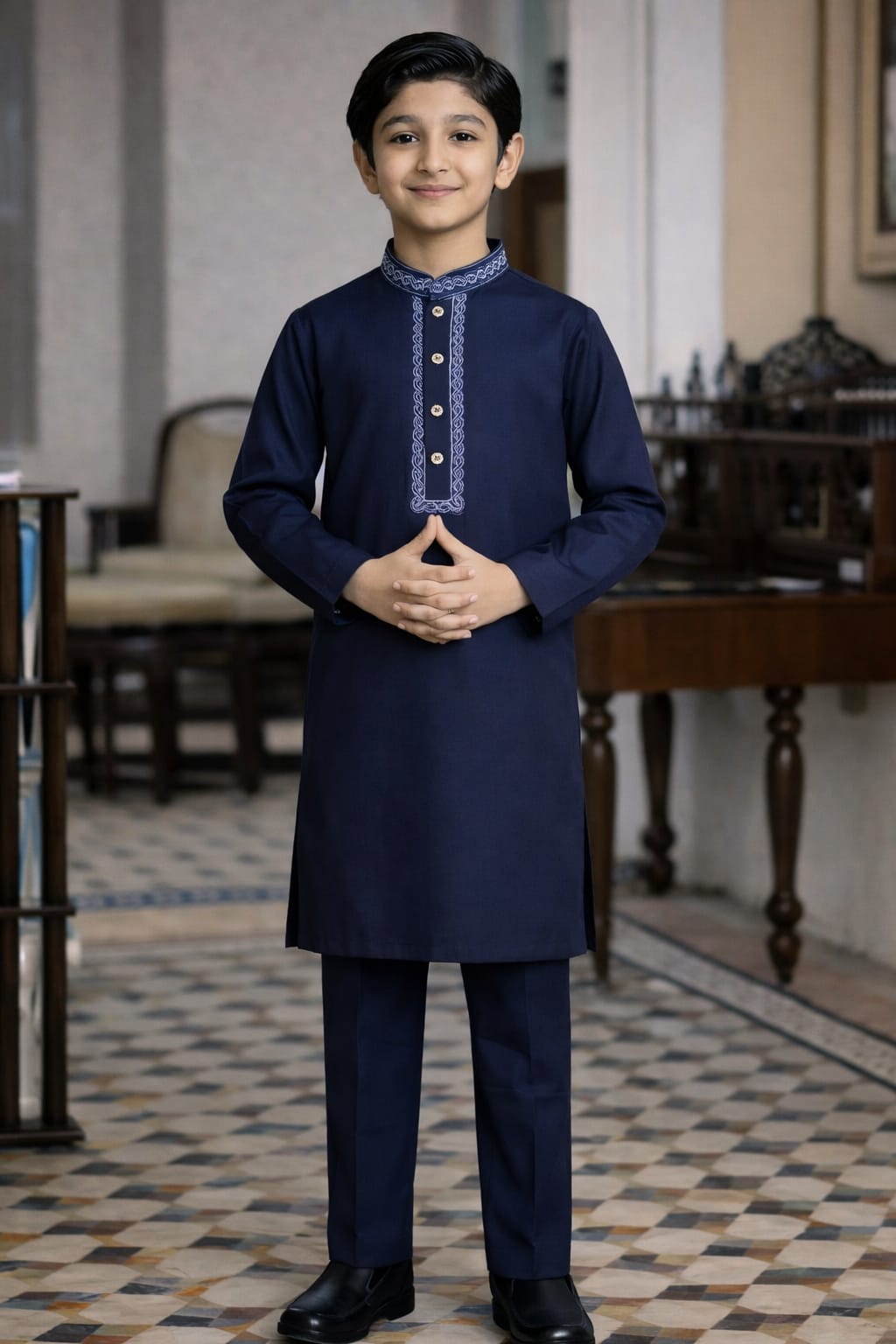 Premium boys’ khaddar kurta in dark navy blue with matching trousers. Warm, elegant, and perfect for winter occasions.This boys’ kurta trouser set is made from high-quality khaddar fabric, designed for winter comfort and a refined traditional look. The dark navy blue color gives a rich and graceful appearance, enhanced by a classic front placket design. Paired with matching trousers, this outfit is ideal for Eid, formal gatherings, and cultural events. Soft, durable fabric ensures comfort throughout the day.