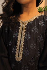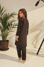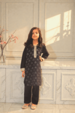 This beautifully tailored girls’ two-piece suit is made from luxurious raw silk in a deep dark navy shade. The shirt is enhanced with intricate heavy embroidery on the front panel, giving it a refined and graceful look. Paired with matching straight trousers, this outfit offers both comfort and elegance, making it ideal for festive occasions, family gatherings, and formal events.