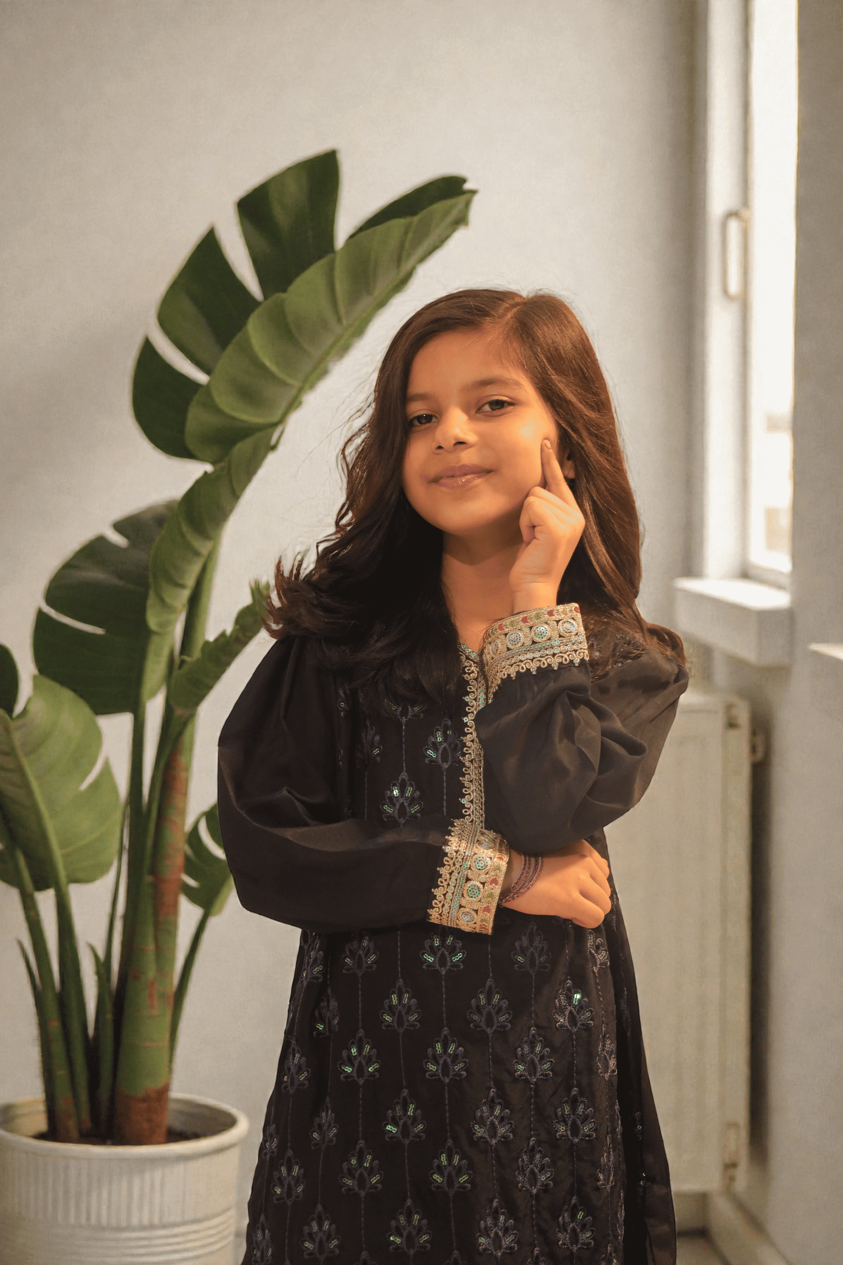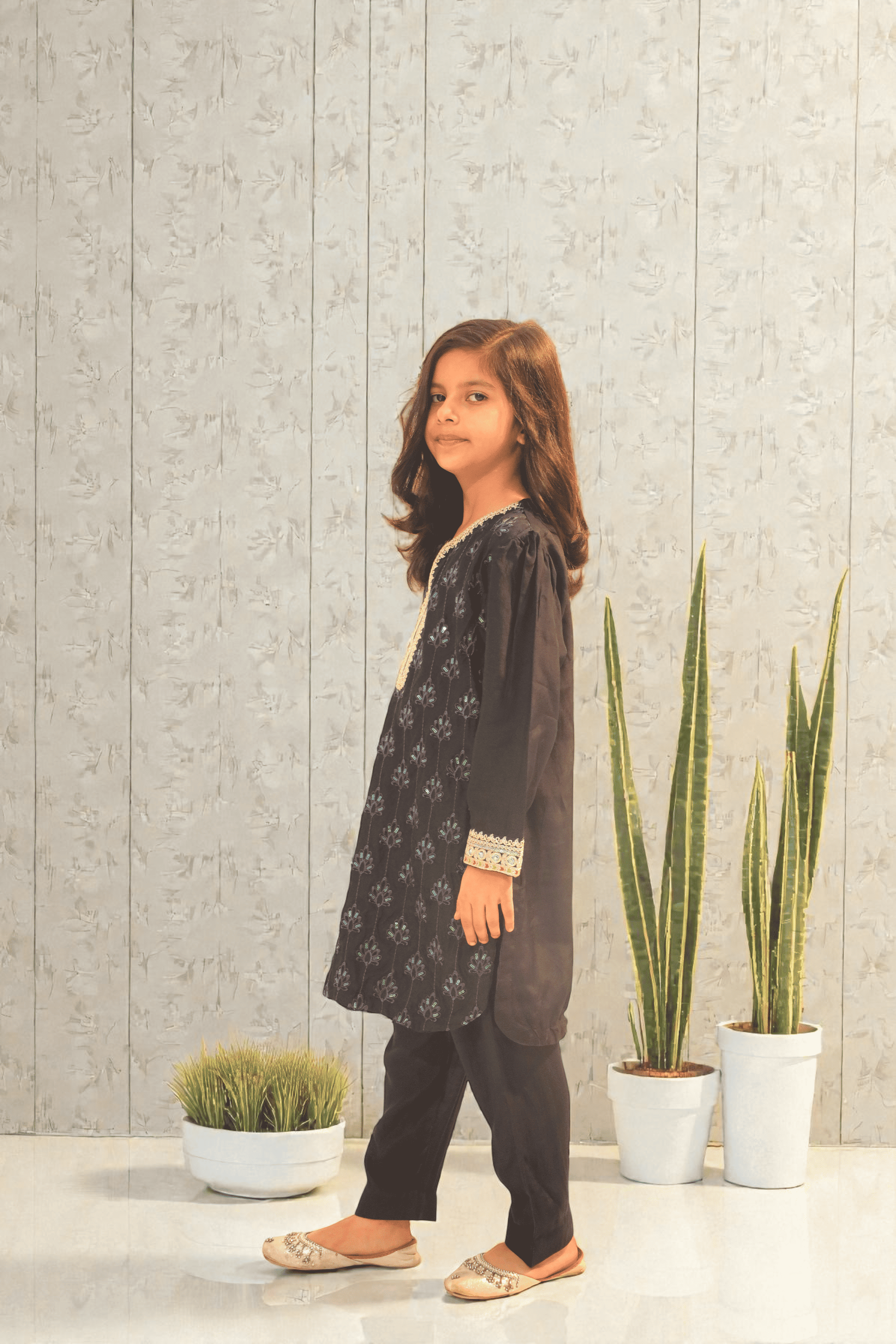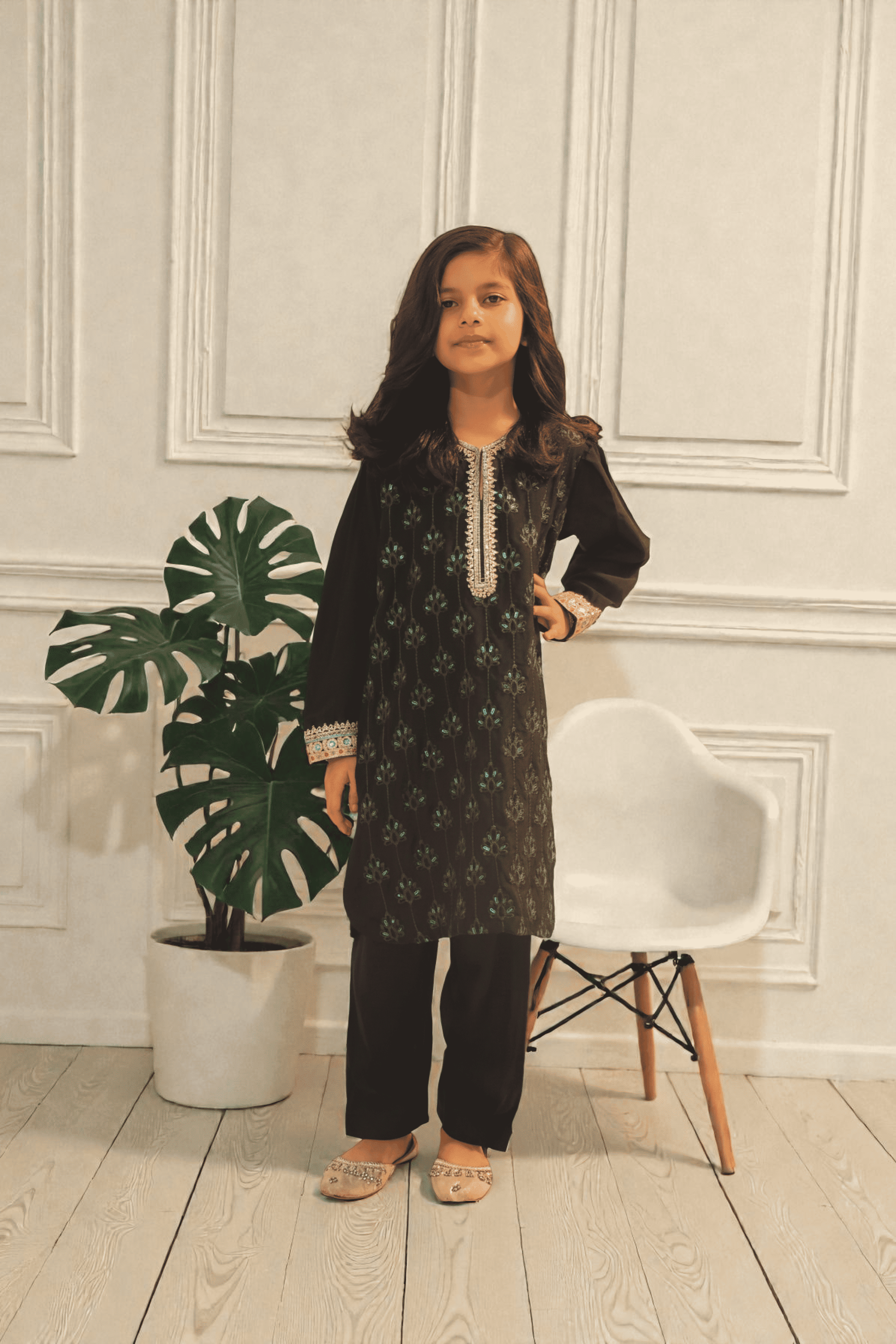 This beautifully tailored girls’ two-piece suit is made from luxurious raw silk in a deep dark navy shade. The shirt is enhanced with intricate heavy embroidery on the front panel, giving it a refined and graceful look. Paired with matching straight trousers, this outfit offers both comfort and elegance, making it ideal for festive occasions, family gatherings, and formal events.