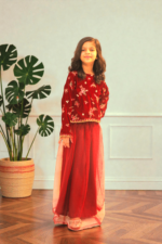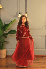 Elegant two-piece girls outfit featuring a premium maroon velvet embroidered top paired with a soft layered net skirt. Perfect for festive and formal occasions. This beautiful girls’ two-piece set is designed to add a luxurious touch to festive wear. The top is crafted from rich velvet fabric with delicate floral embroidery, giving a premium and elegant look. It is paired with a lightweight net skirt that creates a soft, flowy silhouette, making it comfortable yet stylish.