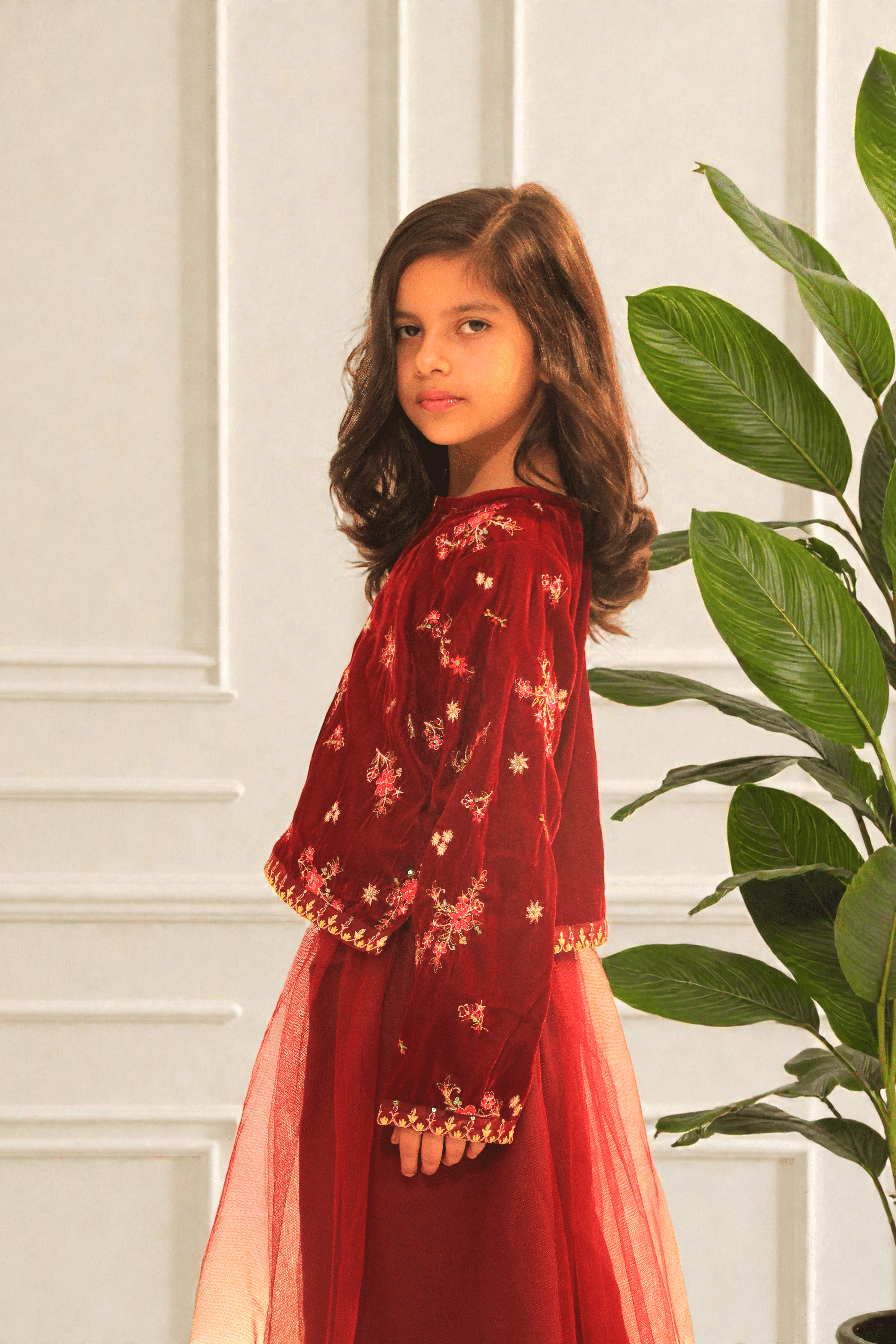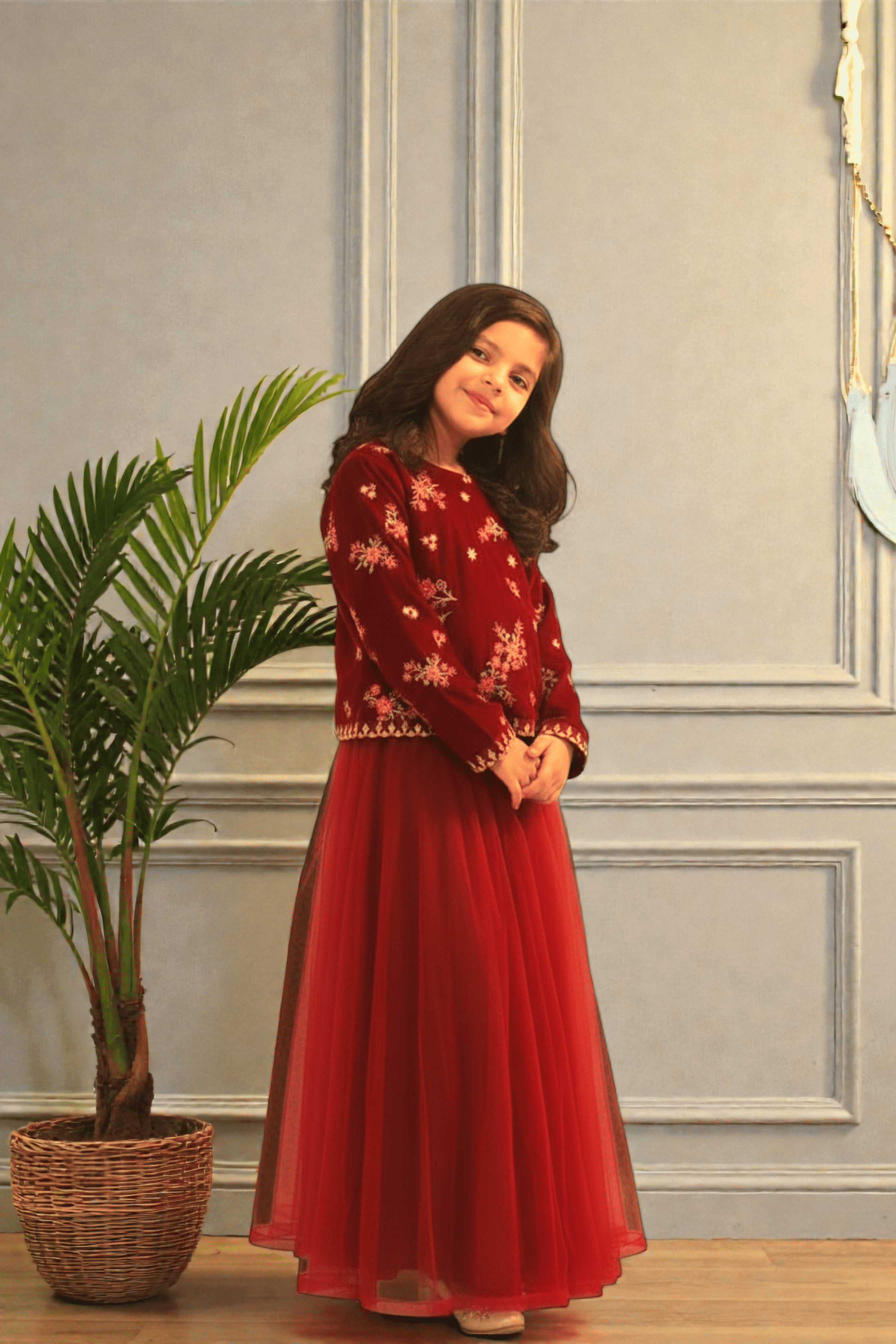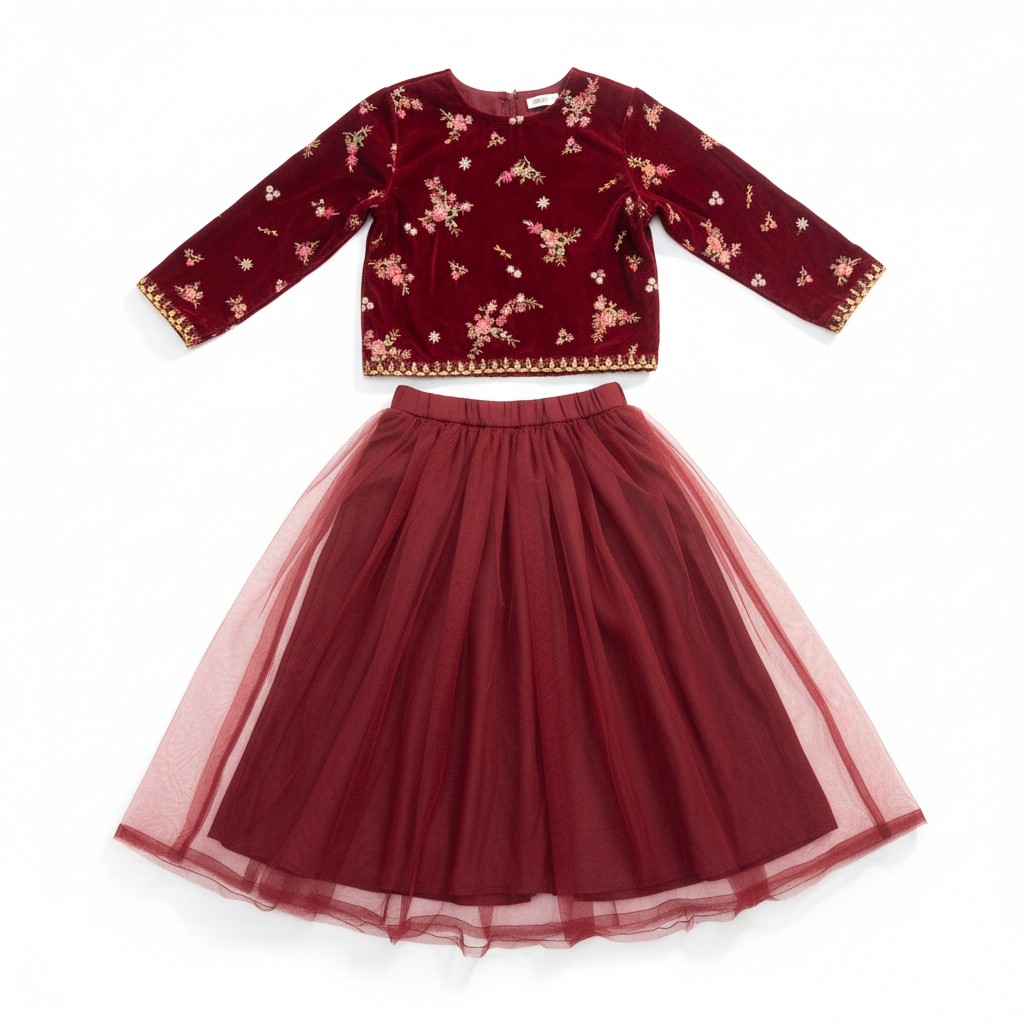 Elegant two-piece girls outfit featuring a premium maroon velvet embroidered top paired with a soft layered net skirt. Perfect for festive and formal occasions. This beautiful girls’ two-piece set is designed to add a luxurious touch to festive wear. The top is crafted from rich velvet fabric with delicate floral embroidery, giving a premium and elegant look. It is paired with a lightweight net skirt that creates a soft, flowy silhouette, making it comfortable yet stylish.