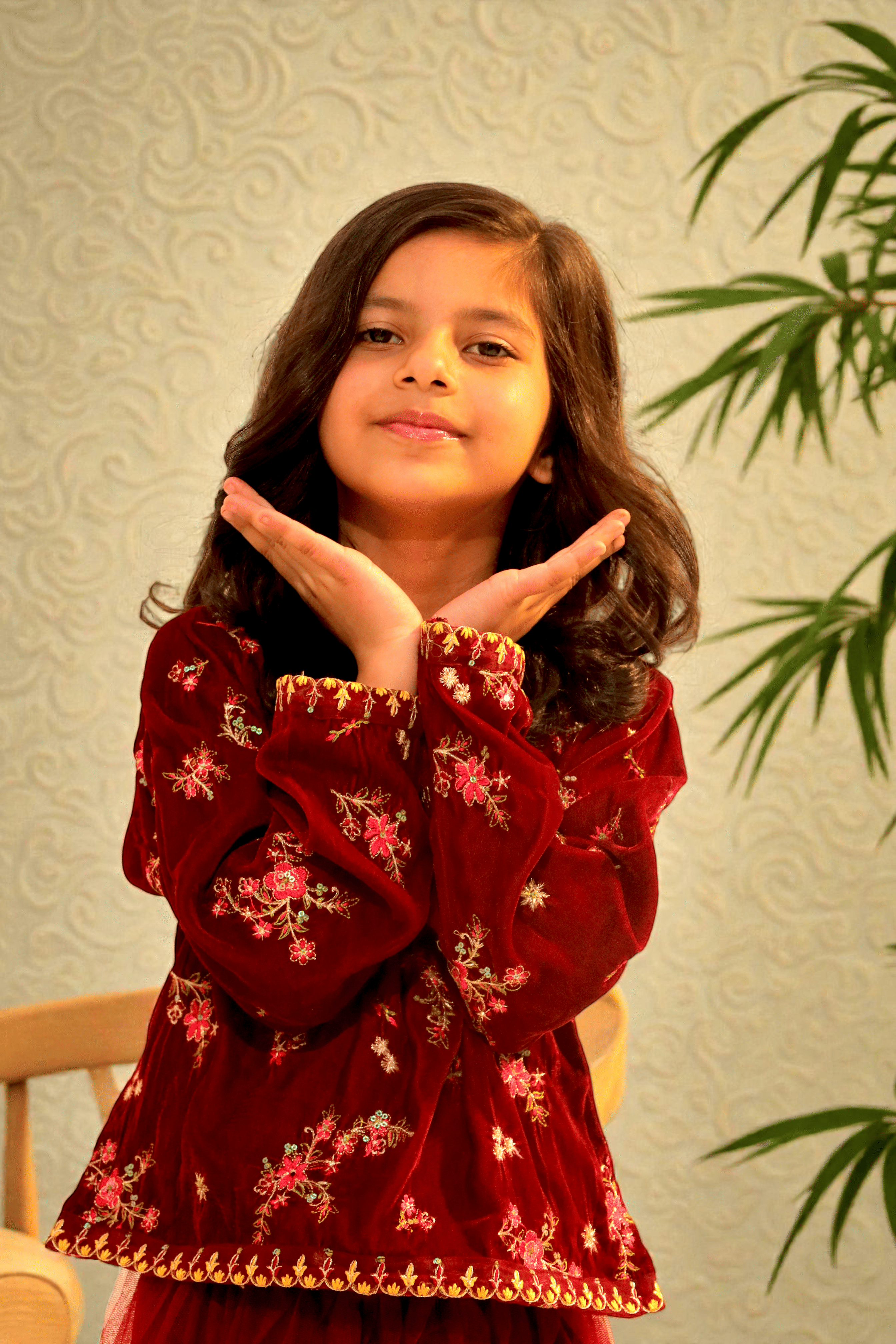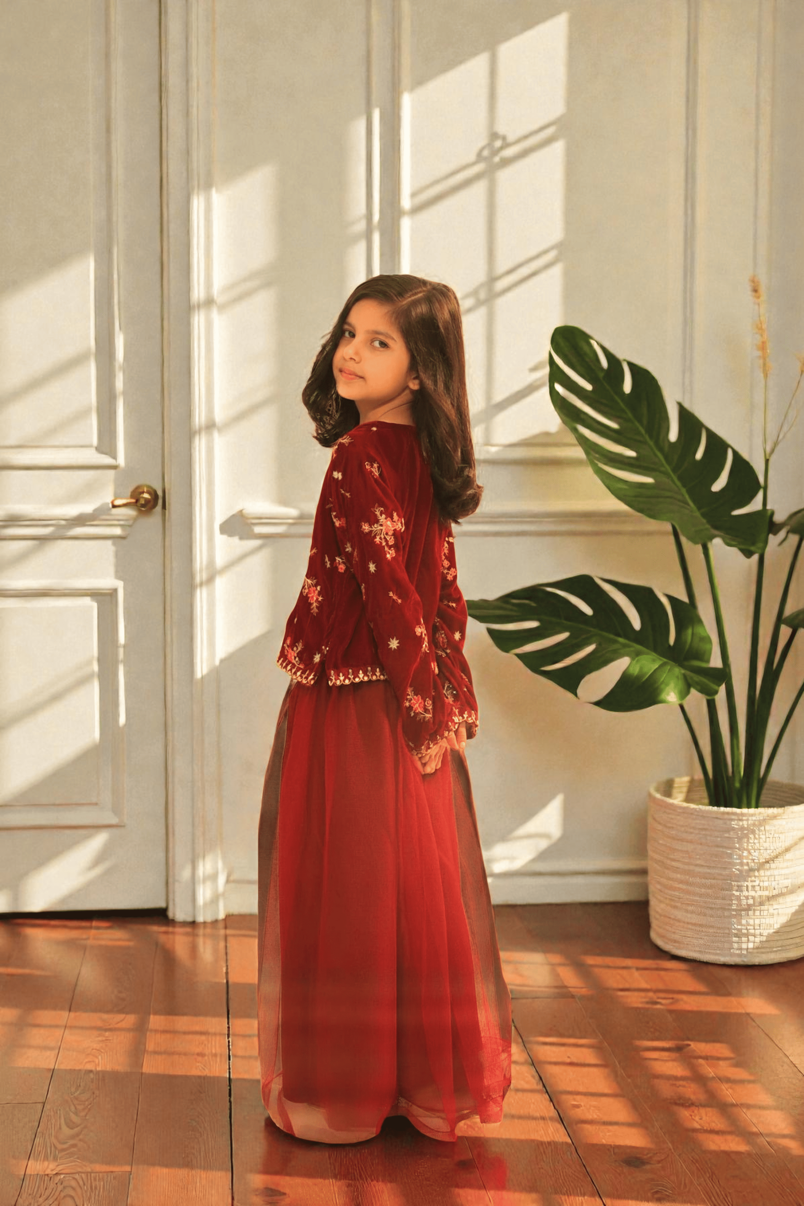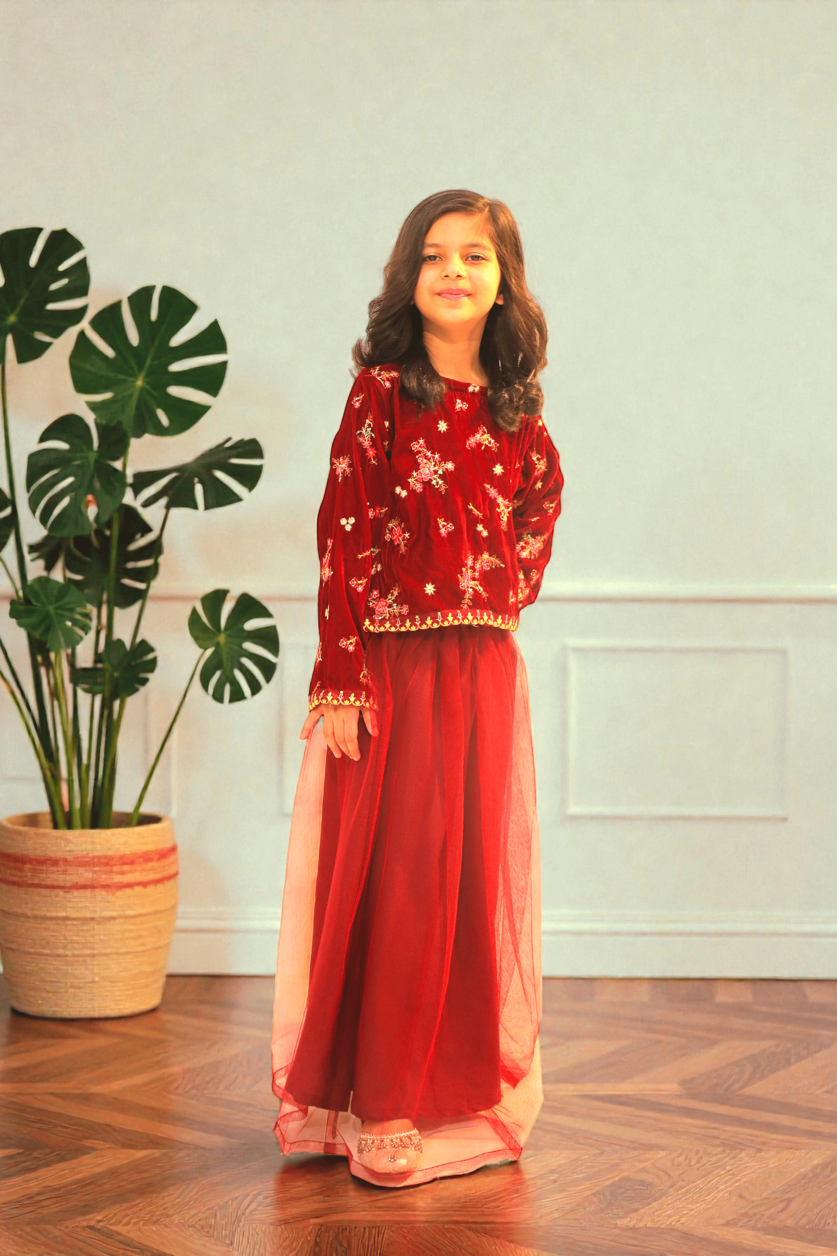 Elegant two-piece girls outfit featuring a premium maroon velvet embroidered top paired with a soft layered net skirt. Perfect for festive and formal occasions. This beautiful girls’ two-piece set is designed to add a luxurious touch to festive wear. The top is crafted from rich velvet fabric with delicate floral embroidery, giving a premium and elegant look. It is paired with a lightweight net skirt that creates a soft, flowy silhouette, making it comfortable yet stylish.