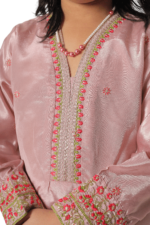 A graceful blush pink girls’ two-piece suit crafted from premium silk fabric, featuring elegant embroidery on neckline, sleeves, and hem for a timeless festive look.