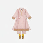 This elegant girls’ two-piece outfit is designed in luxurious silk fabric with a soft blush pink tone that reflects grace and sophistication. The shirt features delicate embroidery on the neckline, cuffs, and hem, adding a refined ethnic touch. Paired with matching straight trousers, this outfit offers both comfort and style, making it perfect for festive celebrations and formal occasions.
