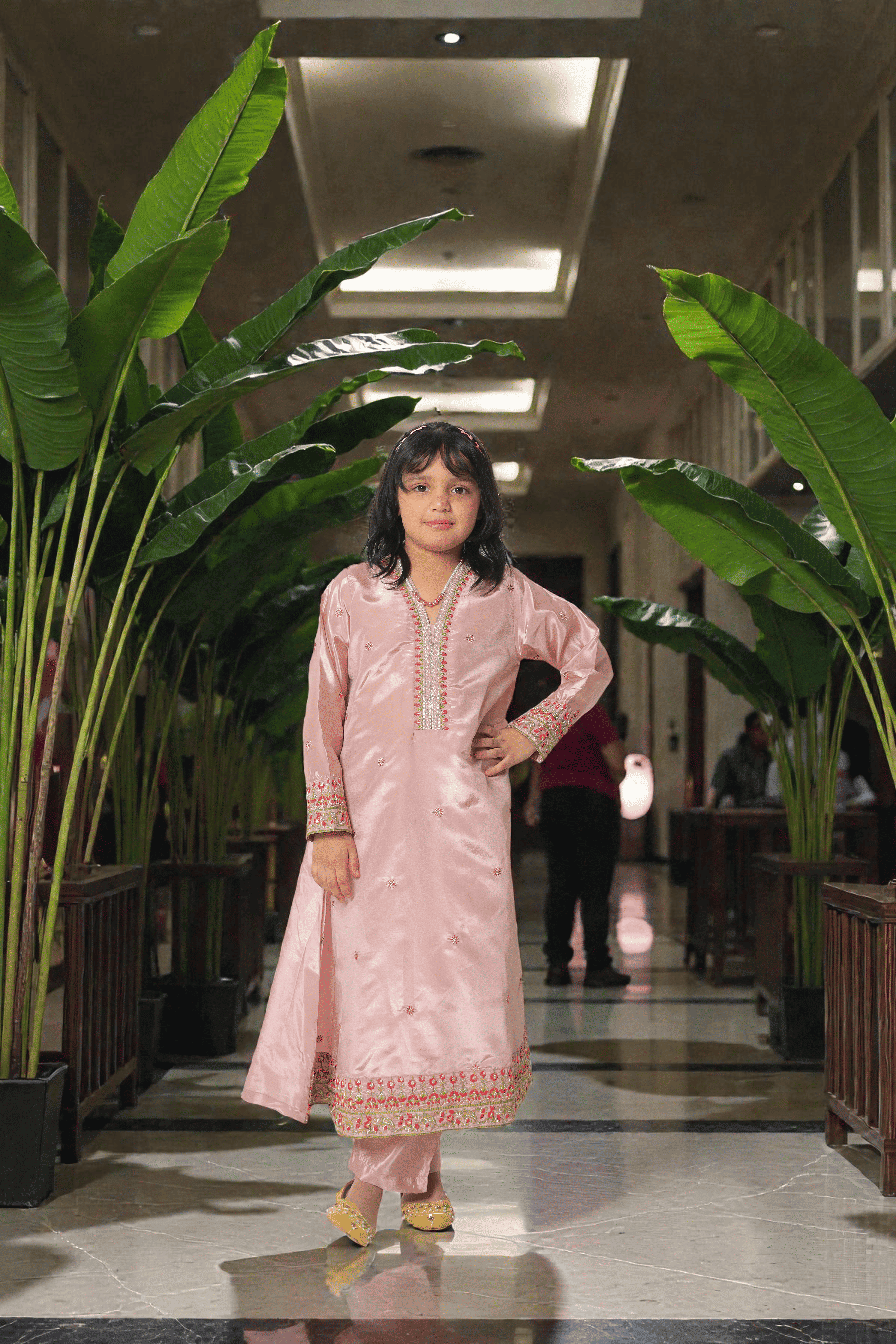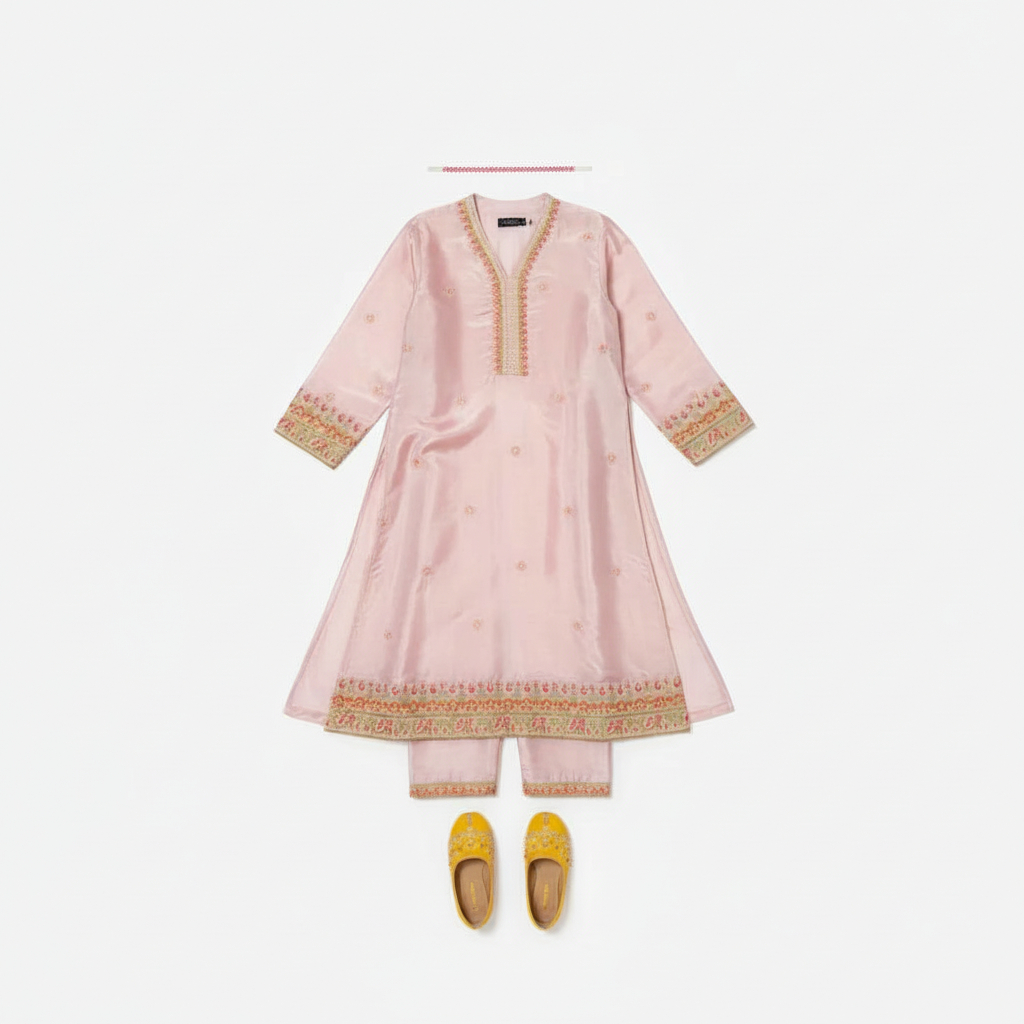 A graceful blush pink girls’ two-piece suit crafted from premium silk fabric, featuring elegant embroidery on neckline, sleeves, and hem for a timeless festive look.